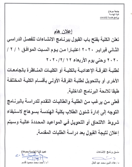 تعلن الكلية بفتح باب القبول ببرنامج الانشاءات للطلاب بالكليه والكليات المناظره بالجامعات الآخرى