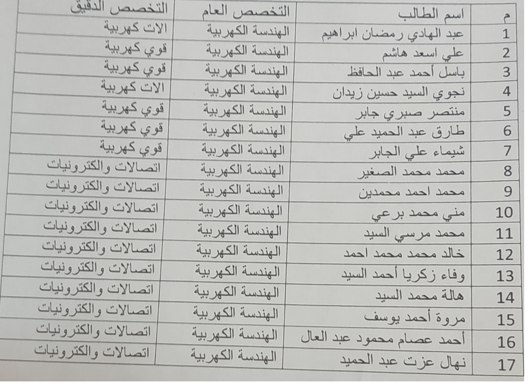 أسماء الطلاب المقبولة للقيد لدرجة الماجستير فى العلوم الهندسية قسم الهندسة الكهربية