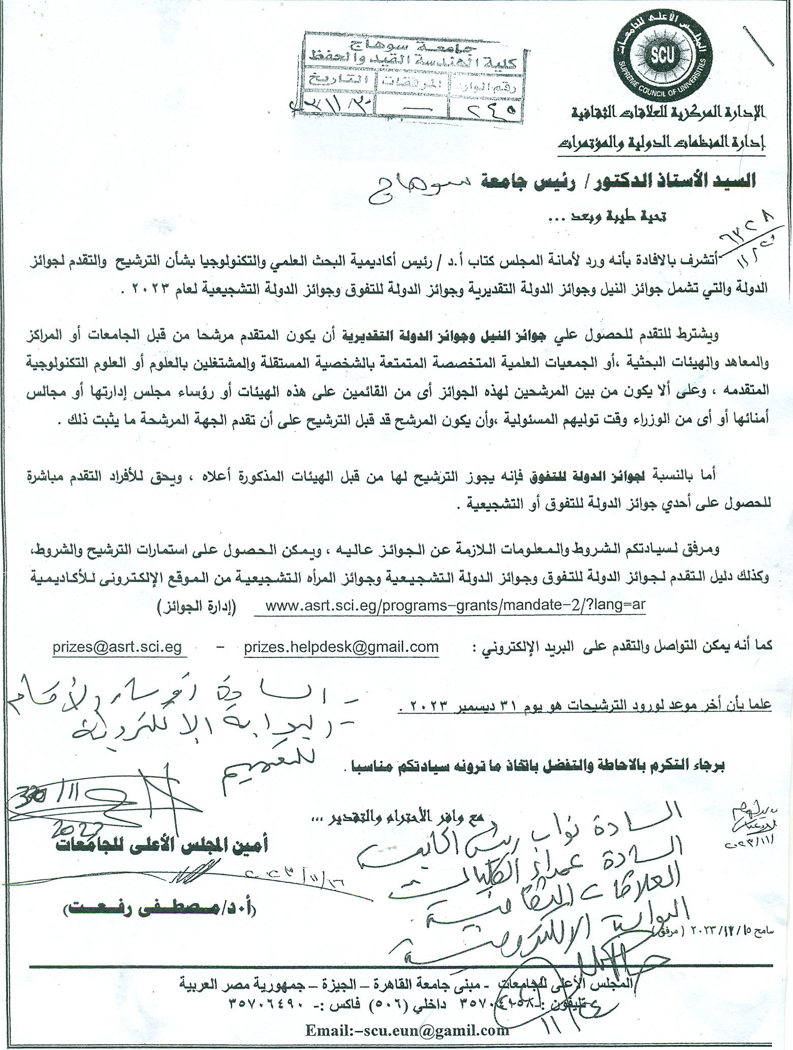 تعميم بخصوص جوائز النيل وجوائز الدولة التقديرية تصفّح المقالات تعميم بخصوص ترشيد استهلاك أوراق الأمتحانات النظرية والعلمية(تعميم) يسر هيئة فولبرايت إن تعلن عن فتح باب التقديم لبرنامج الكليات المجتمعية للعام الأكاديمى 2024-2025