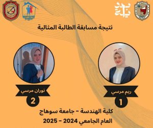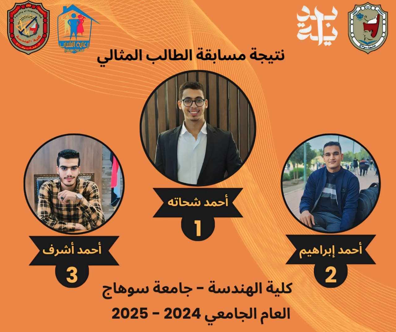 يتقدم السيد الاستاذ الدكتور أحمد قاسم عميد كليه الهندسة و الساده الوكلاء و أعضاء هيئه التدريس و جميع منتسبي كلية الهندسه بالجامعه بالتهنئة للطالب و الطالبه المثالين على مستوى كلية الهندسة بجامعه سوهاج نظرا لتفقوهم العملي و مشاركتهما في الانشطة المختلفة بالكلية و الجامعة و حسن اخلاقهما و تعاونهما مع زملائهم