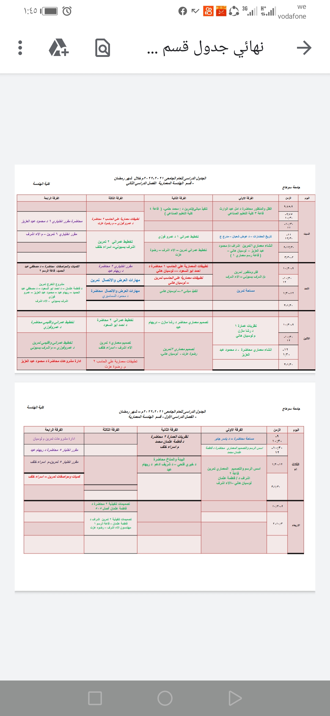 جدول محاضرات قسم الهندسة المعمارية خلال شهر رمضان