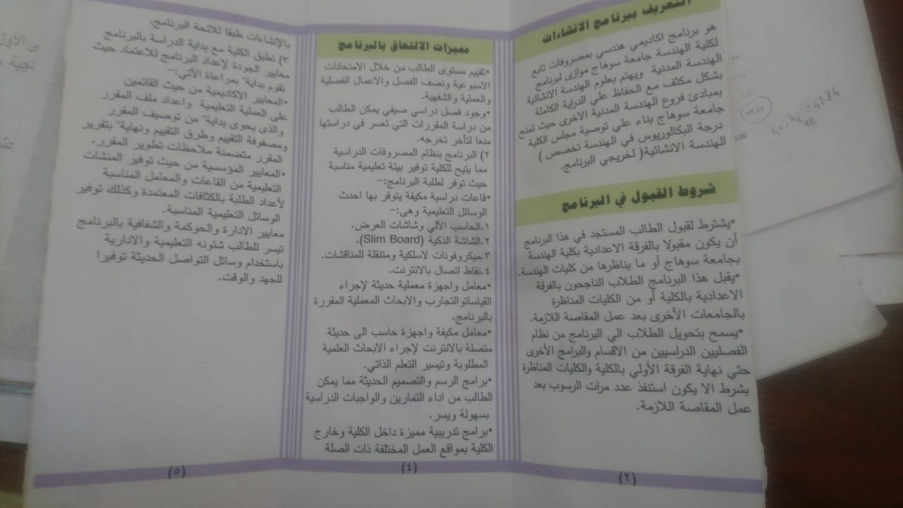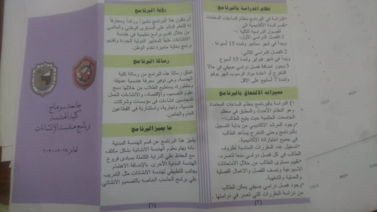 تحت رعاية ا.د/ احمد عزيز رئيس جامعة سوهاج و ا.د/ احمد قاسم عميد كلية الهندسة سوف يتم افتتاح برنامج الانشاءات بكلية الهندسة جامعة سوهاج بالعام الجامعى 2019-2020 م ويوضح الصور المرفقة رسالة وأهداف هذا البرنامج فى خدمة العلوم الهندسية والإنشائية. ولتحميل الملف اضغط هنا