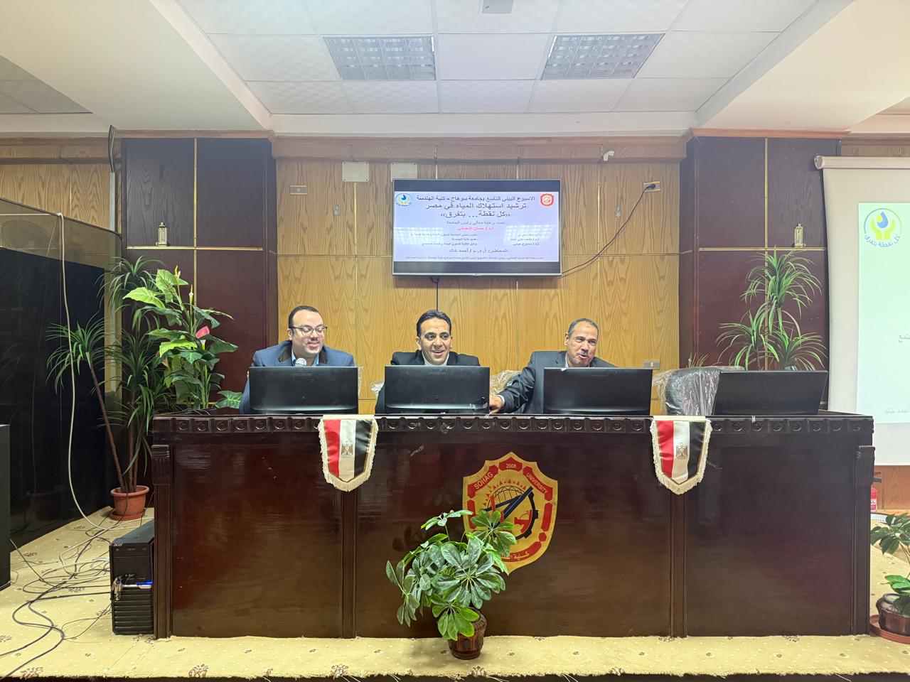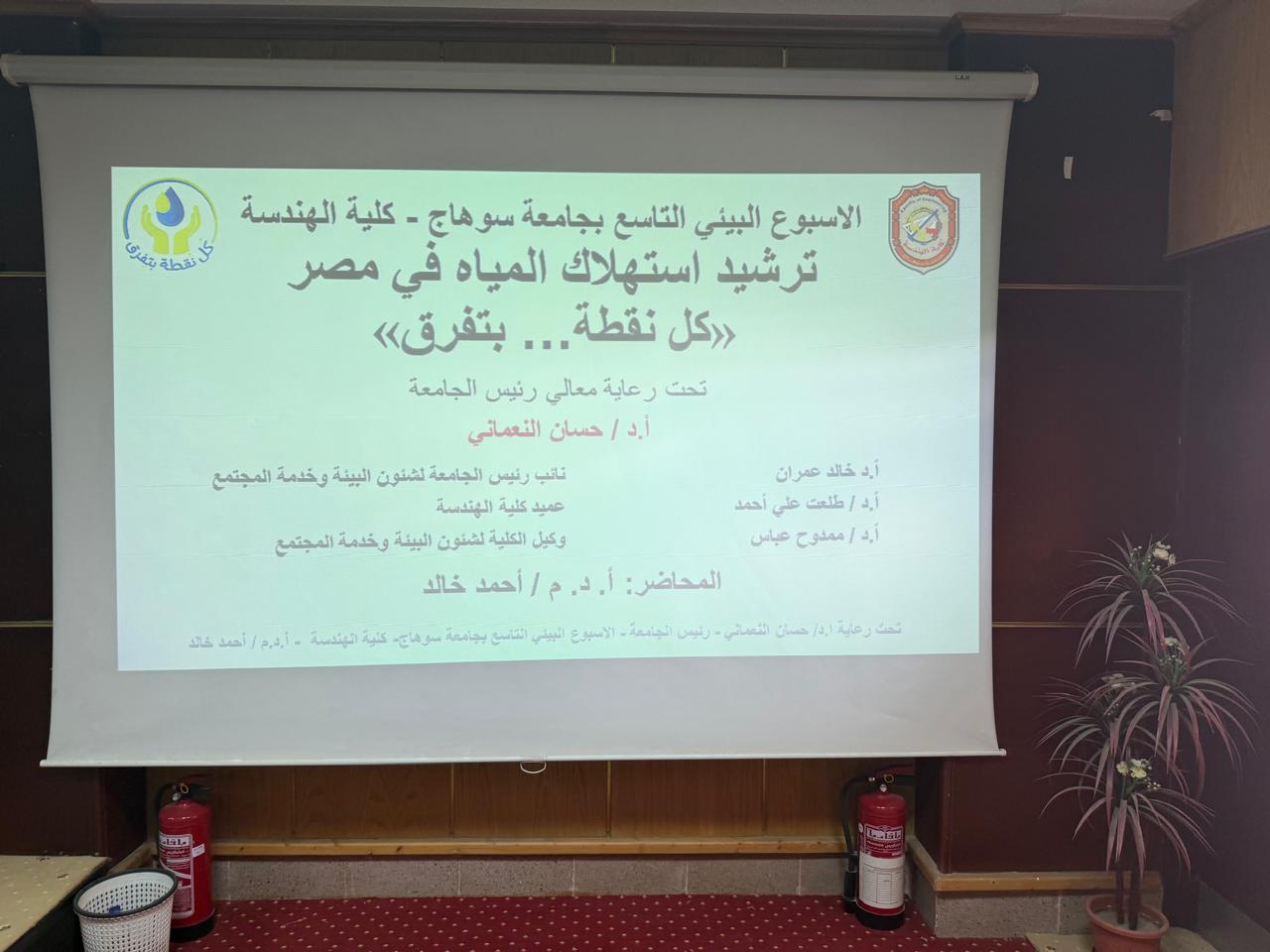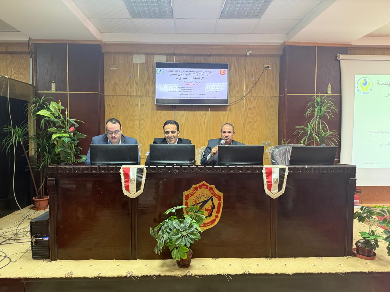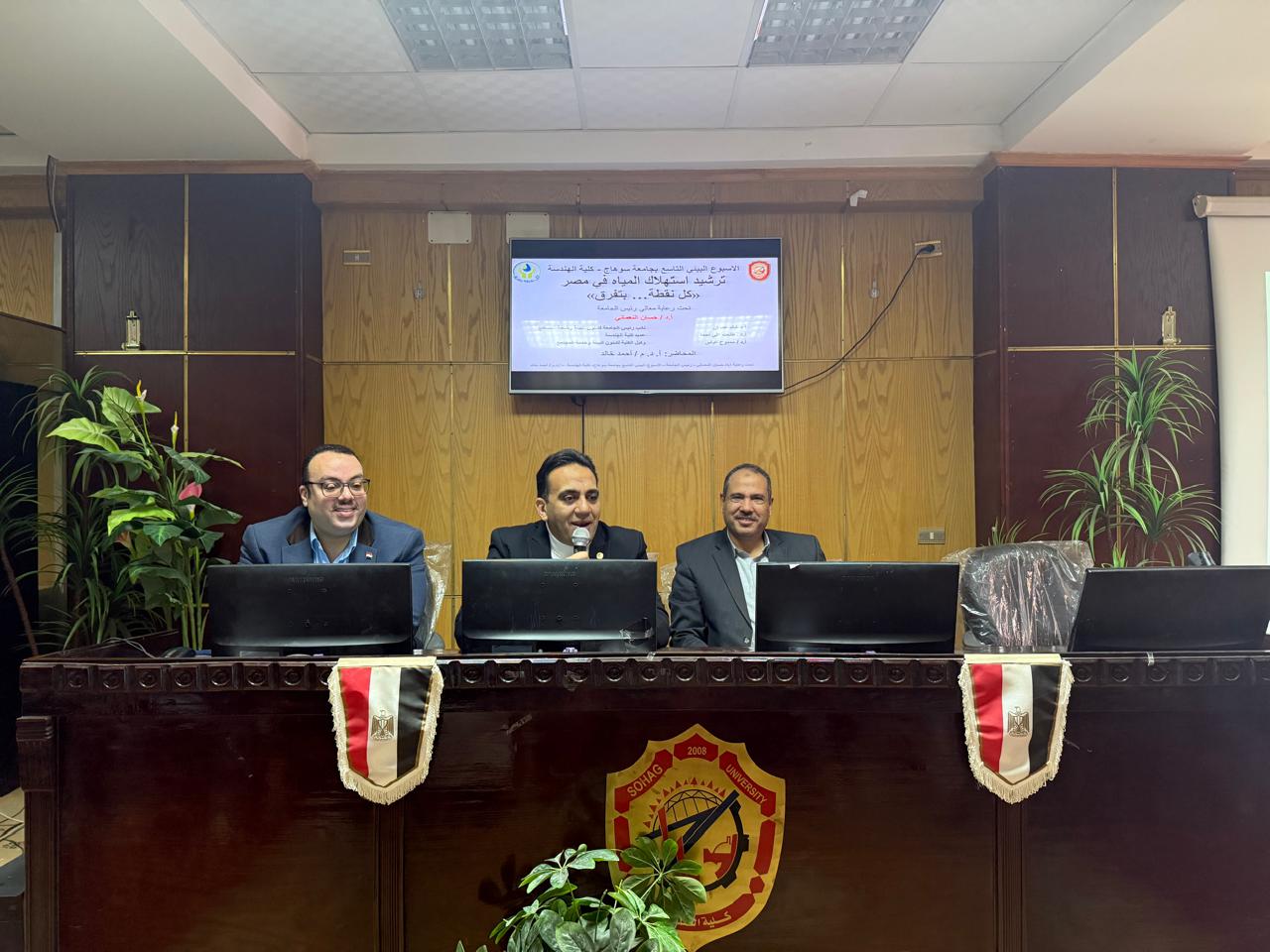 مع استمرار فعاليات الاسبوع البيئي التاسع نظّمت كلية الهندسة اليوم ندوة علمية بعنوان ( ترشيد إستهلاك المياه في مصر ( كل نقطة ………بتفرق) والتي حاضر فيها أ.د/ أحمد خالد عبد اللاه الأستاذ المساعد بقسم الهندسة المدنية بكلية الهندسة جامعه سوهاج